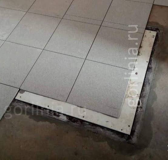 При подготовке напольного отверстия с зазором для посадки рамы 1200х600 обратите внимание на защитные кожухи шарниров и вылет полки наличника 10 мм со стороны петли. Изучите монтажные размеры на схемах в галерее.