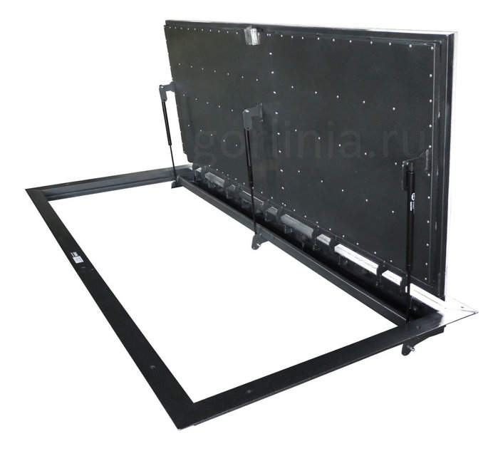 Дверка, зашитая ГВЛ, лежит в одной плоскости с полкой рамы, вся фурнитура расположена внутри: поверхность подготовлена под облицовку плиткой, укладку ламината.